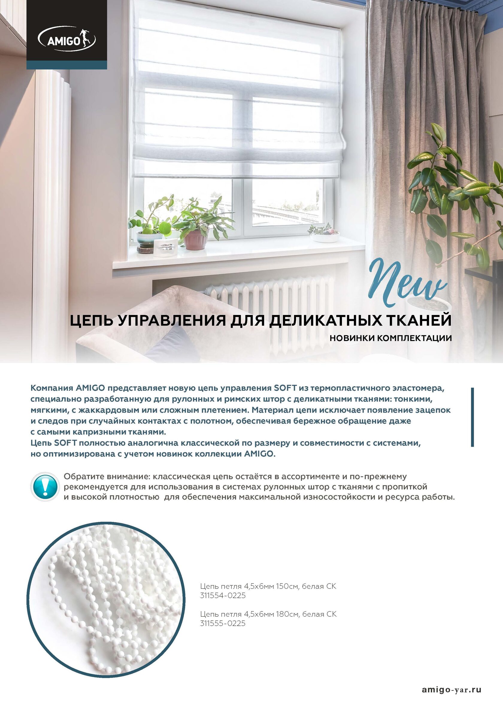 Компания AMIGO представляет новую цепь управления SOFT из термопластичного эластомера, специально разработанную для рулонных и римских штор с деликатными тканями: тонкими,