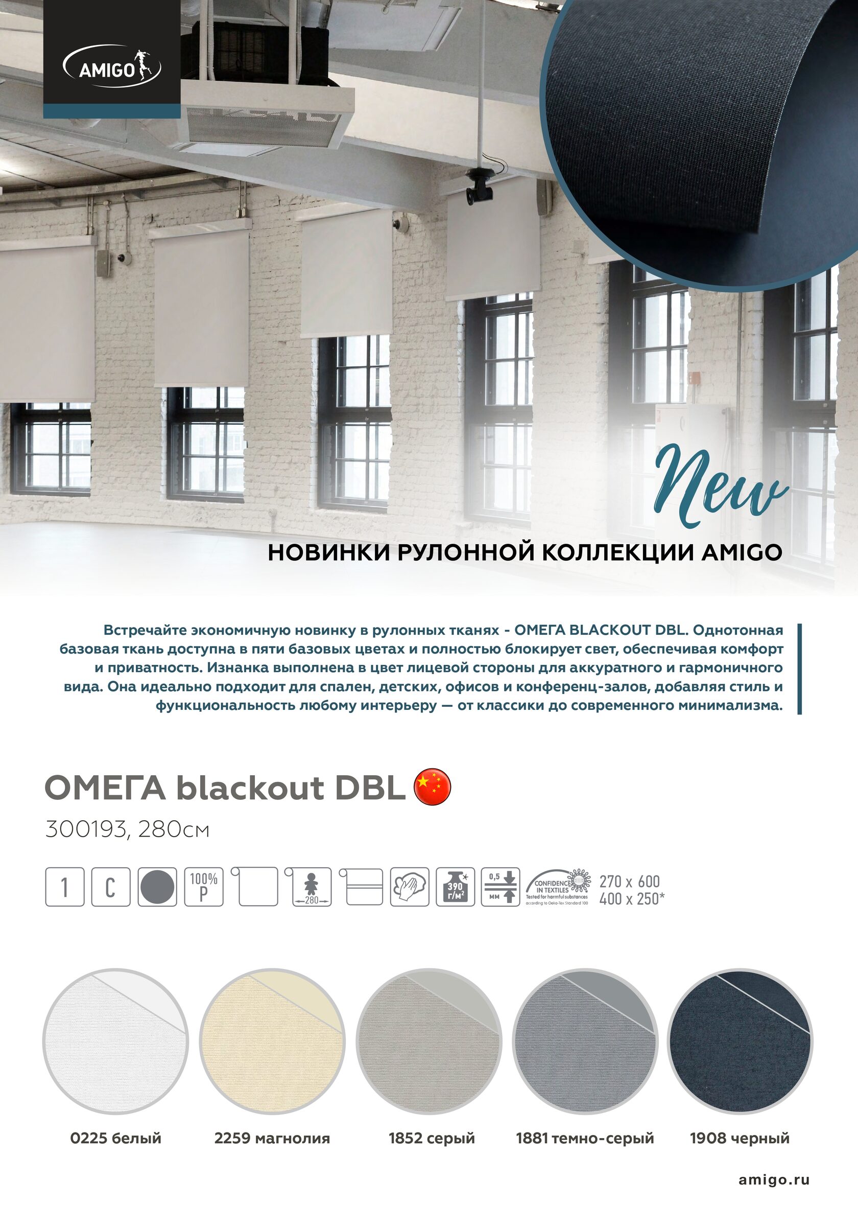 Встречайте экономичную новинку в рулонных тканях - ОМЕГА BLACKOUT DBL. Однотонная базовая ткань доступна в пяти базовых цветах и полностью блокирует свет, обеспечивая комфорт и приватность. Изнанка выполнена в цвет лицевой стороны для аккуратного и гармоничного вида. Она идеально подходит для спален, детских, офисов и конференц-залов, добавляя стиль и функциональность любому интерьеру — от классики до современного минимализма.