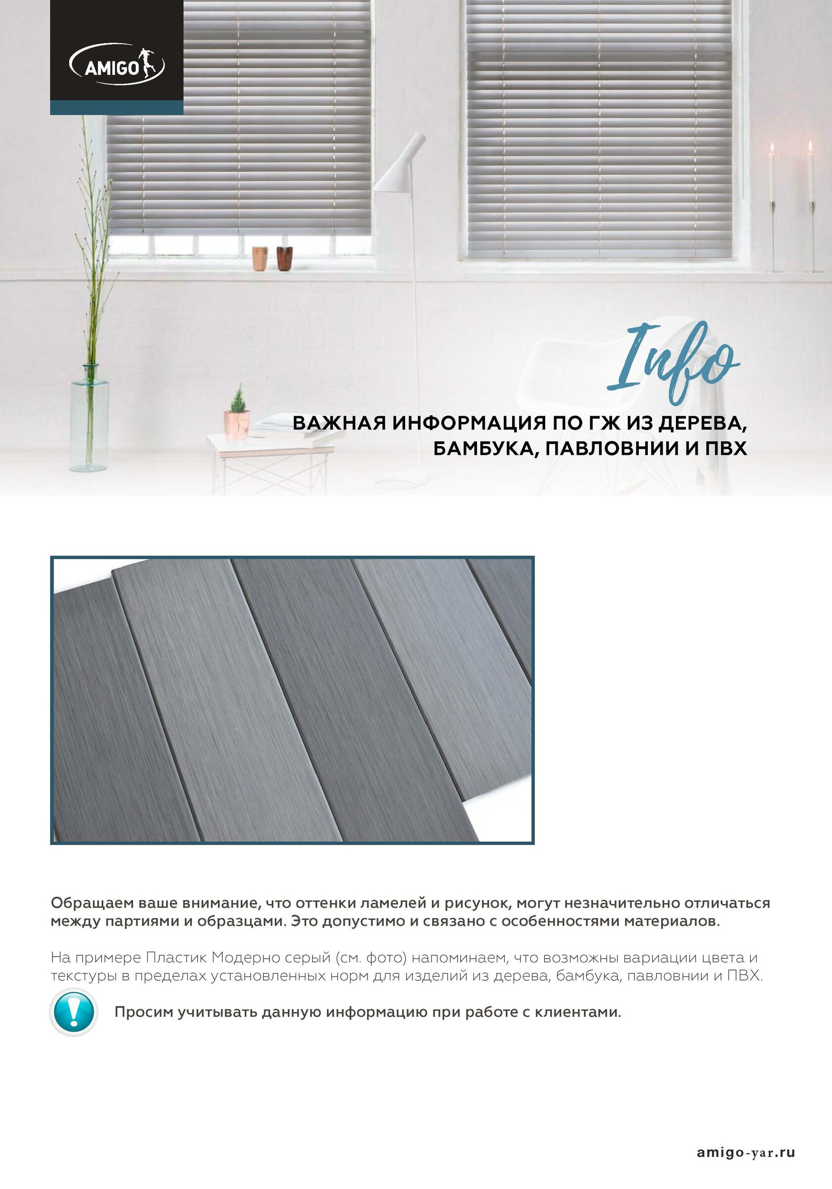 На примере Пластик Модерно серый (см. фото) напоминаем, что возможны вариации цвета и текстуры в пределах установленных норм для изделий из дерева, бамбука, павловнии и ПВХ.