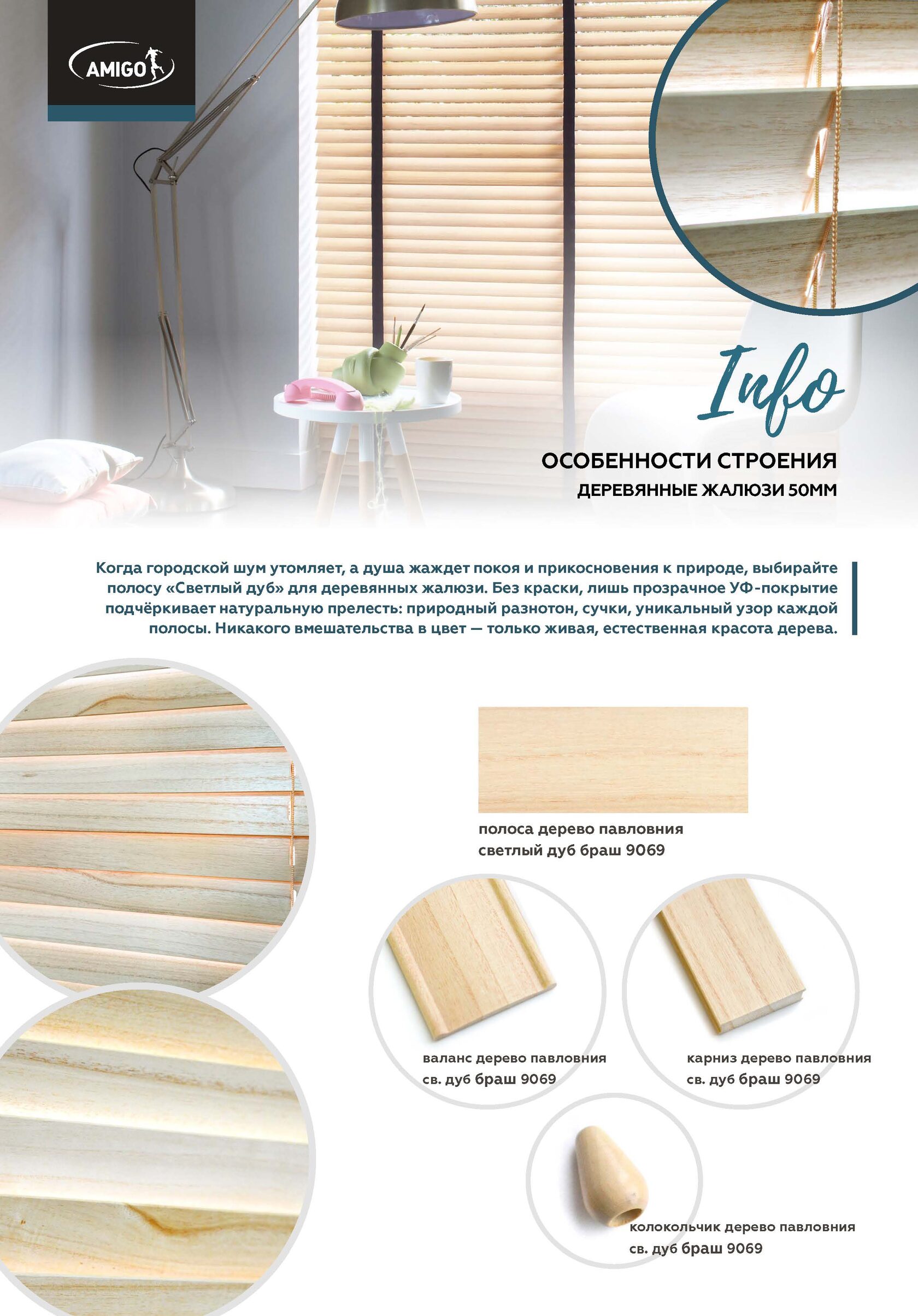 Когда городской шум утомляет, а душа жаждет покоя и прикосновения к природе, выбирайте полосу «Светлый дуб» для деревянных жалюзи. Без краски, лишь прозрачное УФ-покрытие подчёркивает натуральную прелесть: природный разнотон, сучки, уникальный узор каждой полосы. Никакого вмешательства в цвет — только живая, естественная красота дерева.