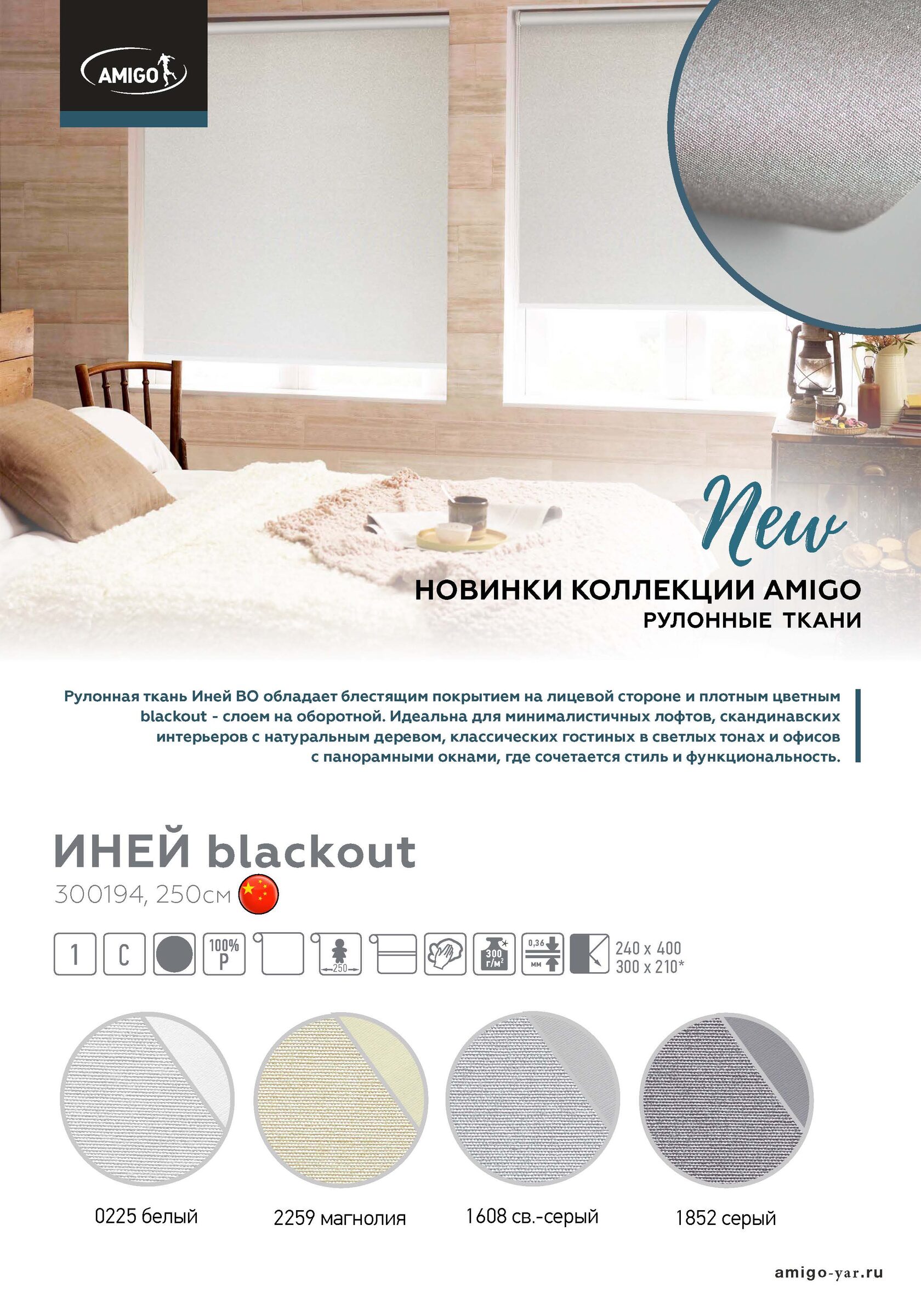 Рулонная ткань Иней BO обладает блестящим покрытием на лицевой стороне и плотным цветным blackout - слоем на оборотной. Идеальна для минималистичных лофтов, скандинавских интерьеров с натуральным деревом, классических гостиных в светлых тонах и офисов с панорамными окнами, где сочетается стиль и функциональность.